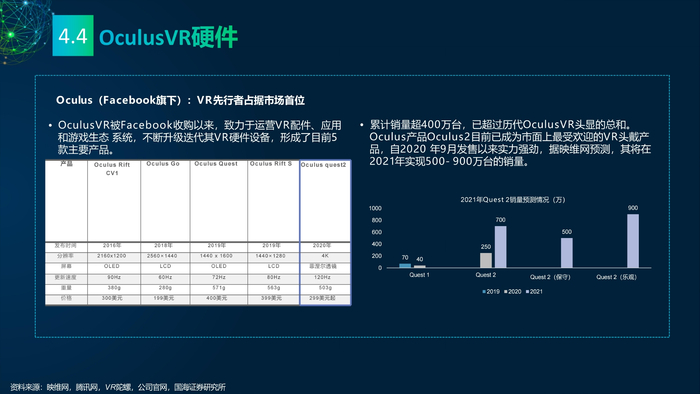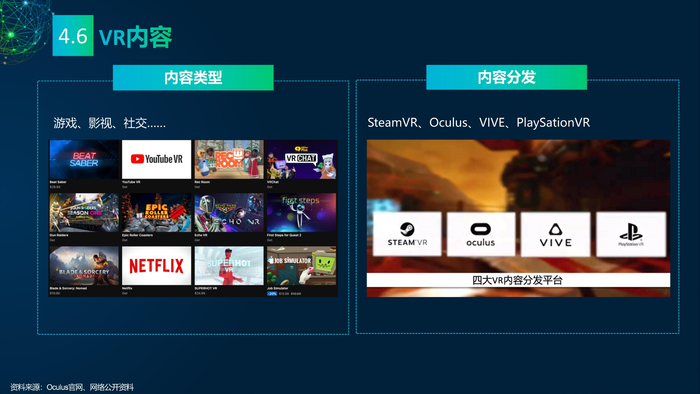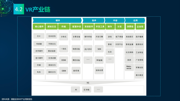 看点4:元宇宙之VR产业。VR产业链主要有四个部分:硬件、软件、内容和应用。在VR硬件方面Oculus占据市场首位;软件方面主要包含VR硬件配套的操作界面和软件开发平台;VR内容有四大分发平台,内容类型涉及游戏、影视、社交等;VR在工业领域的应用主要体现在远程协作,提高沟通效率,优化工作时间。