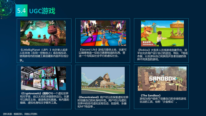 看点5:元宇宙之游戏产业。游戏产业构成包含八大要素:游戏开发者、创作工具、创作工具来源、游戏平台、云服务、终端设备、操作系统供应商、网络运营商。报告特别提出UGC游戏是元宇宙的一个特点,关注元宇宙需要充分认识UGC游戏。