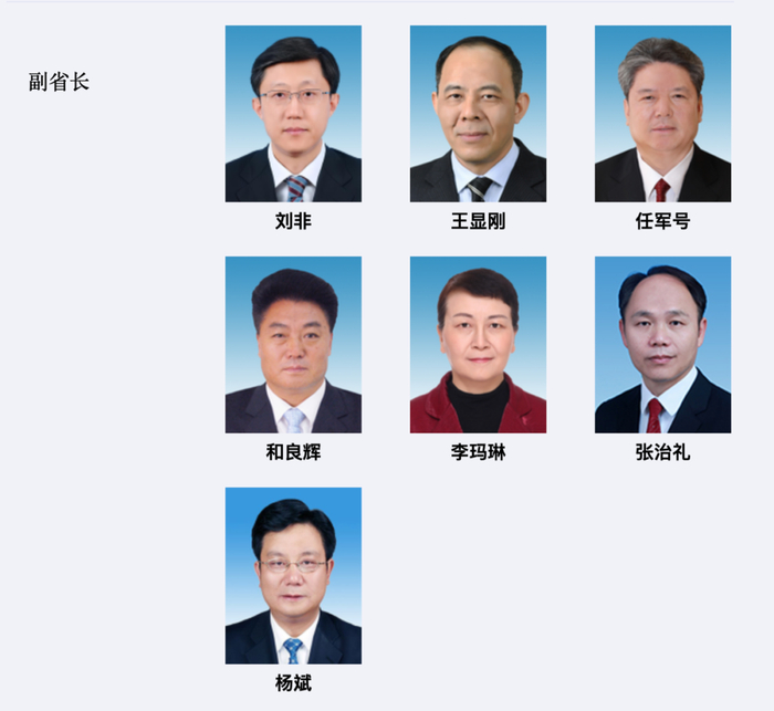 另外5位副省长分别是王显刚(1963年3月生)、任军号(1963年9月生,省公安厅厅长)、和良辉(1962年8月生)、李玛琳(女,1963年10月生)、张治礼(1970年5月生)。