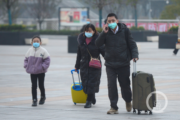 上图为2022年1月17日春运第一天,重庆北站南广场,背着大包小包的乘客踏上回家的旅程。