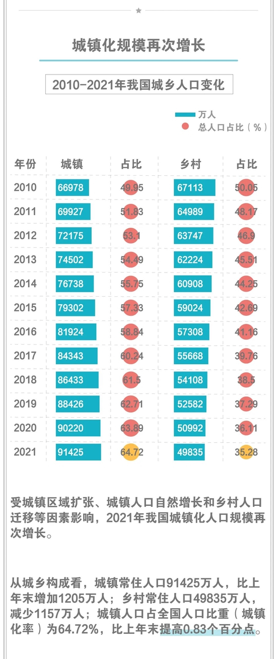 另外就是,农村人口总量自从负增长以来首次降到了5亿以下,只有4.98亿了。从趋势上看,人口的负增长是有递进性的,农村和城市相比,农村先负增长,城市后负增长。而且,如今农村人口只占总人口的三分之一左右了(据国家统计局数据,2021年城镇人口占全国人口比重为64.72%),这也在数据上说明传统的乡村社会向城镇社会的转型。