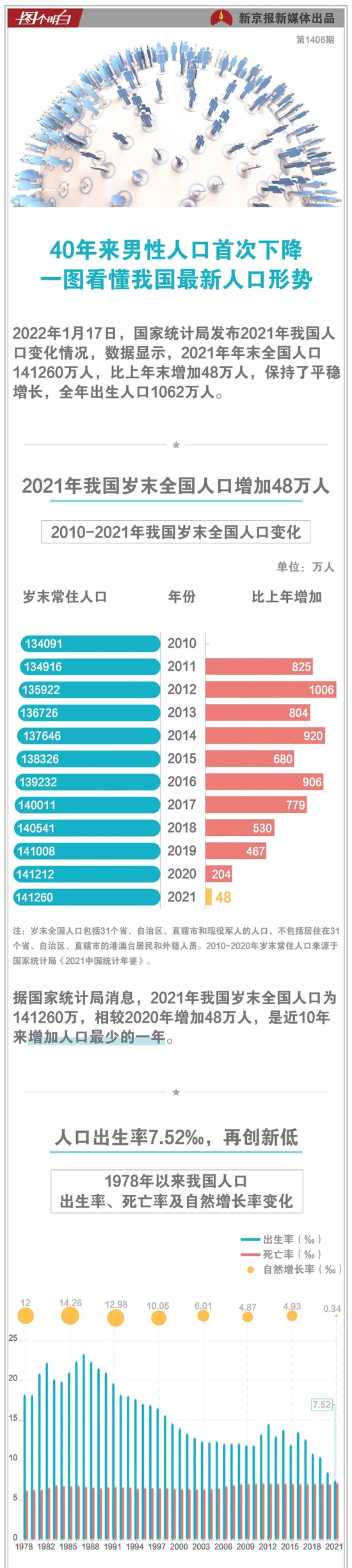 2022年1月17日,国家统计局发布2021年我国人口变化情况,数据显示,2021年年末全国人口(包括31个省、自治区、直辖市和现役军人的人口,不包括居住在31个省、自治区、直辖市的港澳台居民和外籍人员)141260万人,比上年末增加48万人。
