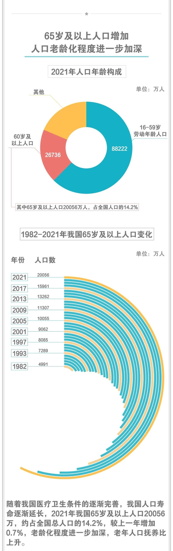 这其中全年出生人口1062万人,保持了平稳增长。其中人口出生率为7.52‰;死亡人口1014万人,人口死亡率为7.18‰;人口自然增长率为0.34‰。65岁及以上人口20056万人,再次增加。