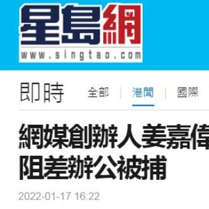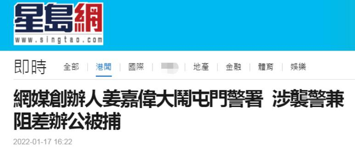 [环球网报道]据香港“星岛网”等港媒消息,黄媒“Free HK Media”创办人姜嘉伟,早前涉嫌煽惑他人参与未经批准集结罪和煽惑他人刑事毁坏罪被警方拘捕,有消息称,姜嘉伟今早(17日)到屯门警署报到时大闹报案室,又用头撞伤一名男警员,被警方以涉嫌阻碍警务人员执行职务罪和袭警罪拘捕。