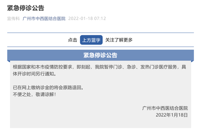 1月18日早上7时许,广州市中西医结合医院发布公告称,根据国家和本市疫情防控要求,即刻起,该院暂停门诊、急诊、发热门诊医疗服务,具体开诊时间另行通知。已在网上缴纳诊金的将会原路退回。