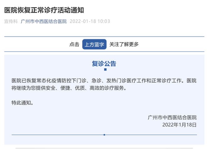 1月18日上午,广州市中西医结合医院发布停诊公告;当天10点03分,该医院发布复诊公告称,已恢复常态化疫情防控下门诊、急诊、发热门诊医疗工作和正常诊疗工作。