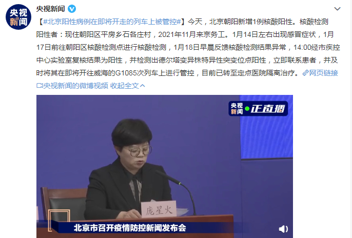 现住朝阳区平房乡石各庄村,2021年11月来京务工。1月14日左右出现感冒症状,1月17日前往朝阳区核酸检测点进行核酸检测,1月18日早晨反馈核酸检测结果异常,经市疾控中心实验室复核结果为阳性,并检测出德尔塔变异株特异性突变位点阳性,立即联系患者,并及时将其在即将开往威海的G1085次列车上进行管控,目前已转至定点医院隔离治疗。