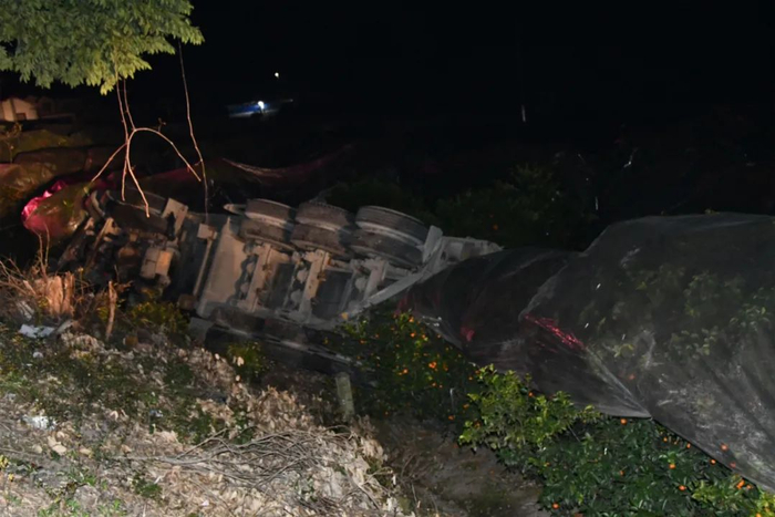 好在重型自卸货车撞上警车后改变了行驶方向,向道路外侧的果地翻去,若径直滑下坡,后果不堪设想。