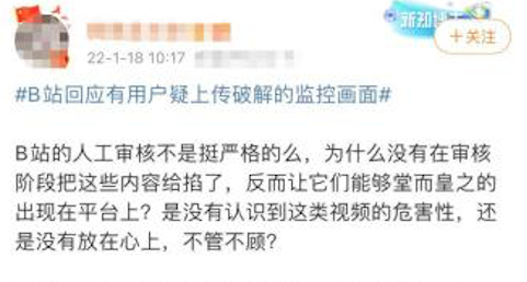 针对该情况,B站官方微博于1月17日发布处理公告:“今日接到用户举报,称疑似有人使用非法手段破解摄像头,上传视频监控画面至B站。我们第一时间组织排查,下架了相关内容。”
