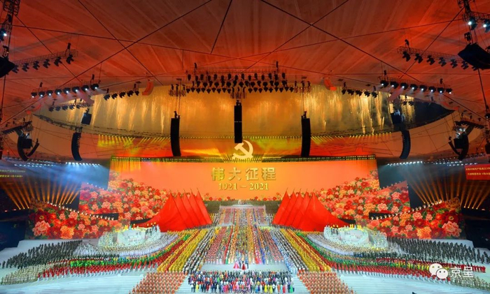 6月28日,庆祝中国共产党成立100周年文艺演出《伟大征程》在国家体育场盛大举行。伴随着主题曲《领航》的旋律,高达16米的金色党徽庄严升起,灿烂的焰火点亮夜空,将演出推向高潮。(方非)