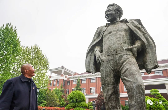在河南兰考焦裕禄干部学院广场,“焦桐” 管护人魏善民凝望高大的焦裕禄塑像。(刘平)