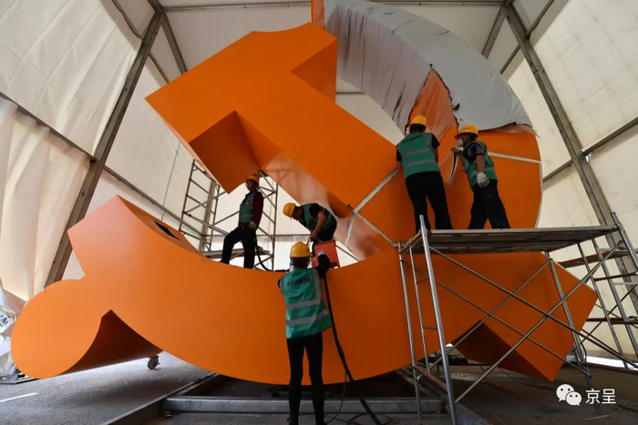 5月20日,工人在喷涂用于天安门广场“七一”庆祝大会的党徽。(蔡代征)