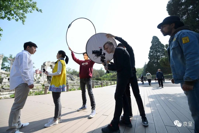 4月23日,为迎接中国共产党成立100周年,北京交通大学留学生组成拍摄团队在圆明园西洋楼遗址旁进行“大道之行”短视频的拍摄。(和冠欣)