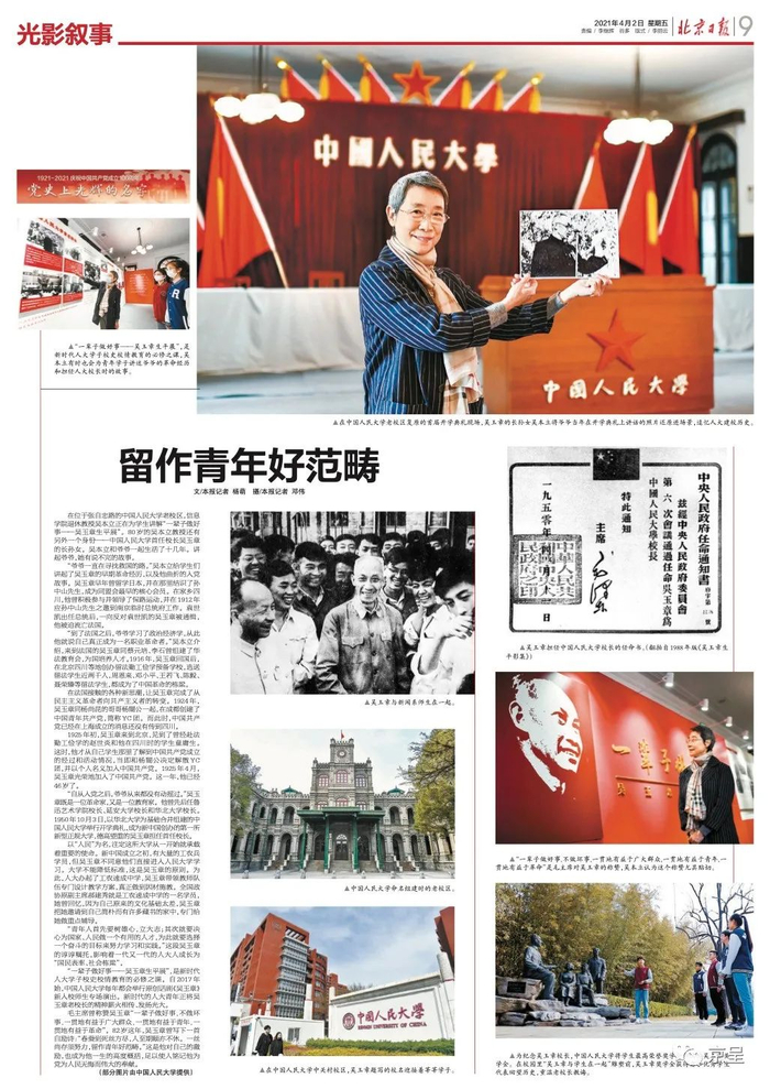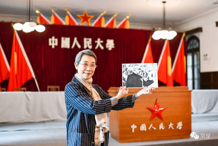 在中国人民大学老校区复原的首届开学典礼现场,吴玉章的孙女吴本立将爷爷当年在开学典礼上讲话的照片还原进场景,追忆人大建校历史。(邓伟)
