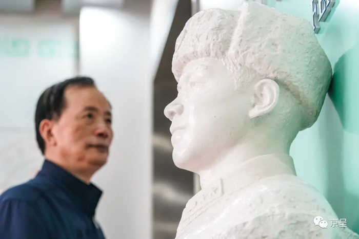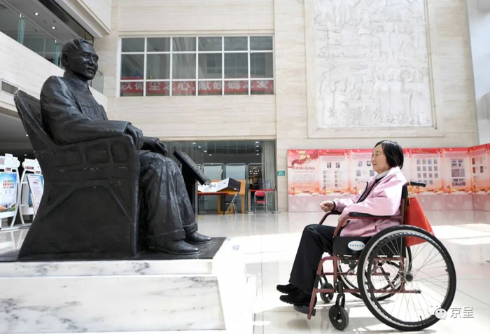 在北京理工大学良乡校区徐特立图书馆一层大厅,徐禹强在祖父徐特立的雕像前静坐深思,回忆祖父对自己的谆谆教导。(和冠欣)