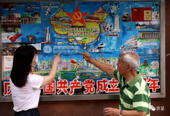 7月5日,85岁的崔伯艺老人完成了主题为“庆祝中国共产党成立100周年”的板报墙。(吴镝)