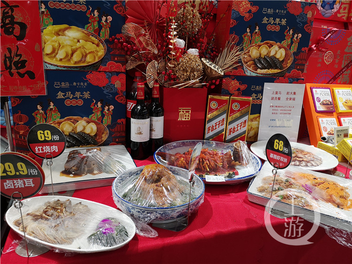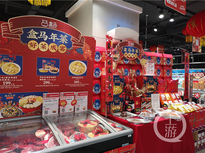佛跳墙、花胶鸡、松鼠桂鱼、酸菜炖大骨、八宝饭······在位于重庆观音桥的盒马鲜生,上游新闻记者见到不少预制年菜的模型一字排开,营造出了浓浓的团年大餐氛围。这些预制菜既有单份菜品,也有适合4到6人、6到8人的年菜套餐,可供不同需求的消费者选择。