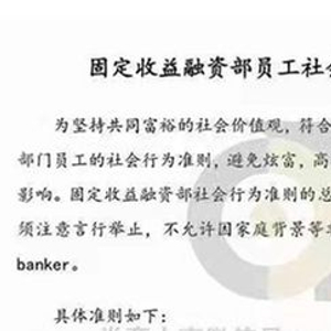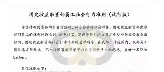 该券商固收部提出了行为规范的总原则,即部门的工作范围内员工须注意言行举止,不允许因家庭背景等非自身因素产生优越感,当好一名职业banker。“为坚持共同富裕的社会价值观,符合当前的社会形势,固定收益融资部出台部门员工的社会行为准则,避免炫富,高调等行为给公司甚至整个行业带来负面影响。”规范中这一表述,正体现了当下行业已出现的一些问题。