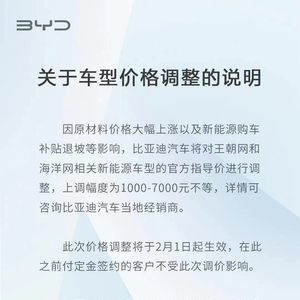 新京报贝壳财经讯(记者 白昊天)1月21日,贝壳财经记者从比亚迪官方获悉,因原材料价格大幅上涨以及新能源购车补贴退坡等影响,比亚迪汽车将对王朝网和海洋网相关新能源车型的官方指导价进行调整,上调幅度为1000-7000元不等。此次价格调整将于2月1日起生效,在此之前付定金签约的客户不受此次调价影响。