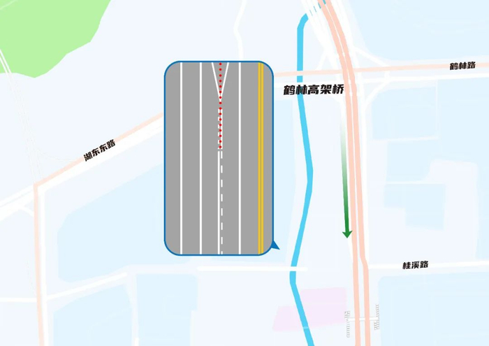 考虑到鹤林高架下桥处辅道车辆并入主道对连江北路主道通行的影响,届时,鹤林高架下桥处至岳峰高架上桥处仅允许主道车辆并入辅道,不再允许辅道车辆并入主道,目前鹤林高架下桥处的虚实线也将使用磁吸式柱桩予以隔离。