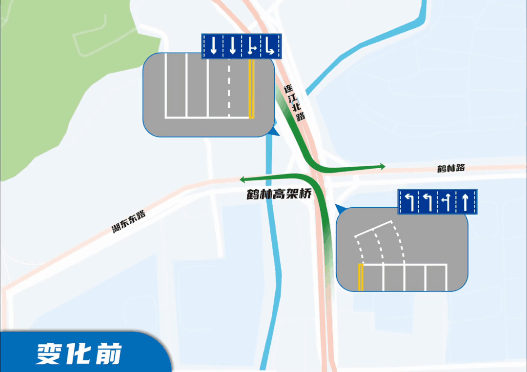 同时,连江北路三八路路口北侧车道由“1左1直左2直”调整为“2左1直左1直”,连江路主路下匝道后车辆允许变道最左侧车道左转,辅道(登云路)来车方向只能靠最左侧的左转车道通行,禁止直行。连江北路三八路路口南侧车道由“2左1直左1直”调整为“3左1直”,增加1个左转待转区,调整后,路口南侧机动车根据信号灯指示通行。
