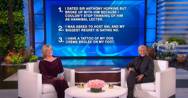 当地时间20日,美国“家政女王”玛莎·斯图尔特在脱口秀节目《艾伦秀》中透露,自己曾与英国老戏骨安东尼·霍普金斯有过一段恋情。