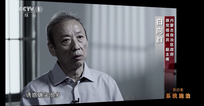 白向群忏悔道:“内蒙古这样的资源富集地区,企业家给你行贿也好,送东西也好,诱惑确实很多。”白向群说,“最大的诱惑就是说了算,你为老板批这个,批那个,你抵御不了这种诱惑,最终的结果就上秦城。”