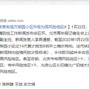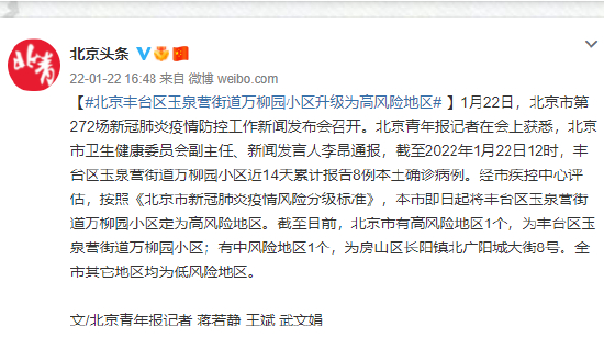 1月22日,北京市第272场新冠肺炎疫情防控工作新闻发布会召开。北京青年报记者在会上获悉,北京市卫生健康委员会副主任、新闻发言人李昂通报,截至2022年1月22日12时,丰台区玉泉营街道万柳园小区近14天累计报告8例本土确诊病例。经市疾控中心评估,按照《北京市新冠肺炎疫情风险分级标准》,本市即日起将丰台区玉泉营街道万柳园小区定为高风险地区。截至目前,北京市有高风险地区1个,为丰台区玉泉营街道万柳园小区;有中风险地区1个,为房山区长阳镇北广阳城大街8号。全市其它地区均为低风险地区。