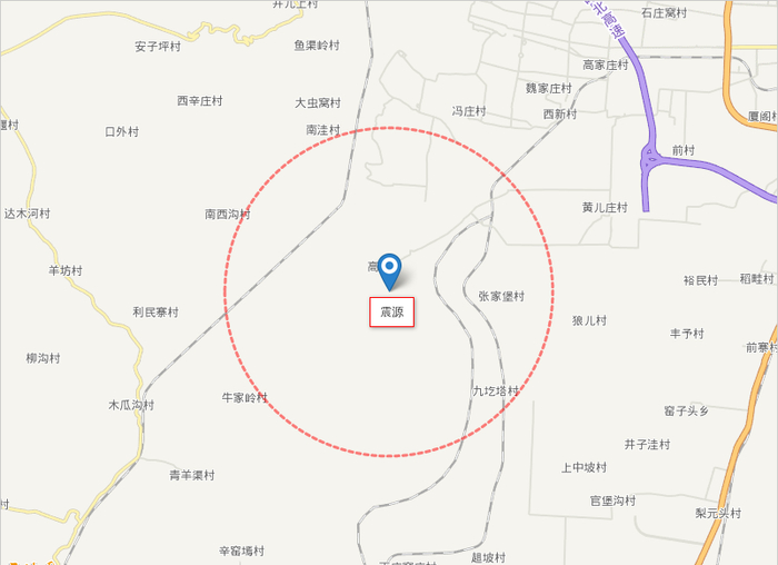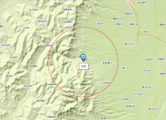 (以震中为圆心,中心虚线表示5公里,次级虚线表示20公里范围内)