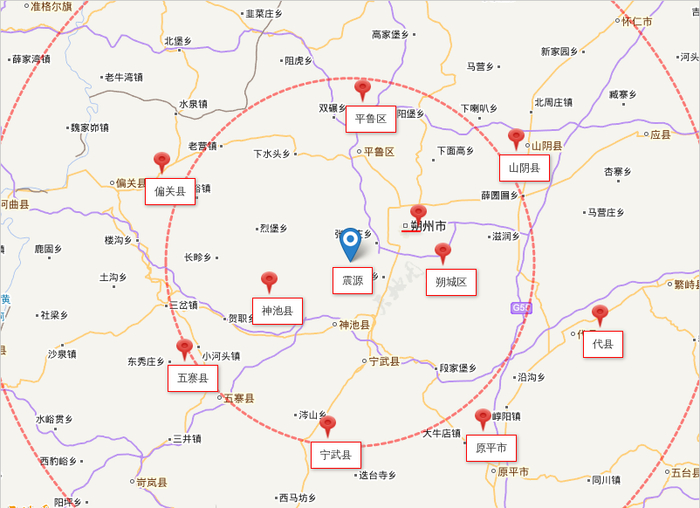 震中距离21公里、距离神池县23公里、距离朔城区25公里、距离平鲁区43公里、距离宁武县47公里、距离五寨县52公里、距离山阴县54公里、距离偏关县56公里、距离原平市58公里、距离代县70公里。