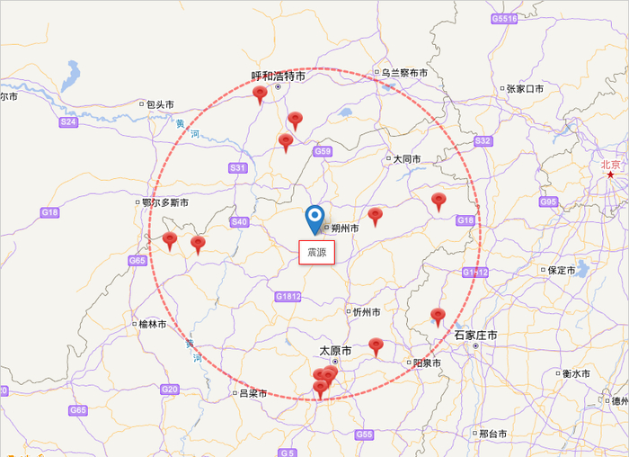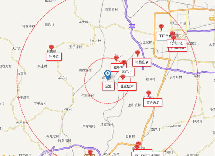 (以震中为圆心,中心虚线表示50公里,次级虚线表示100公里范围内)
