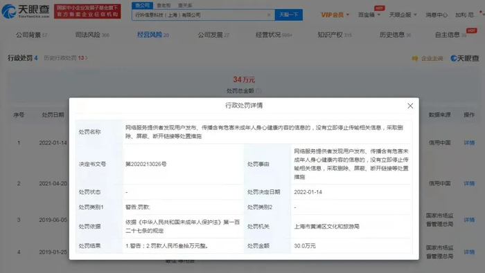天眼查App显示,近日,小红书关联公司行吟信息科技(上海)有限公司因违反未成年人保护法,被上海市黄浦区文化和旅游局罚款30万元,具体处罚事由为:网络服务提供者发现用户发布、传播含有危害未成年人身心健康内容的信息,没有立即停止传输相关信息,采取删除、屏蔽、断开链接等处置措施。