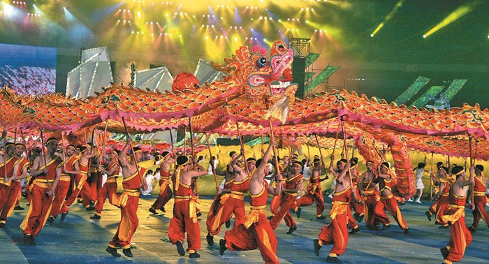 2009年建国60周年前夕,铜梁舞龙队应邀准备了两条百米长龙即将进京参加国庆晚会表演,市委领导邀请我同去观摩他们的最后彩排,并为之送行。我亲眼目睹了百米长龙在铜梁大体育馆翻江倒海、摇头摆尾、金光闪动、火树银花、万人山呼海啸的壮美景象。