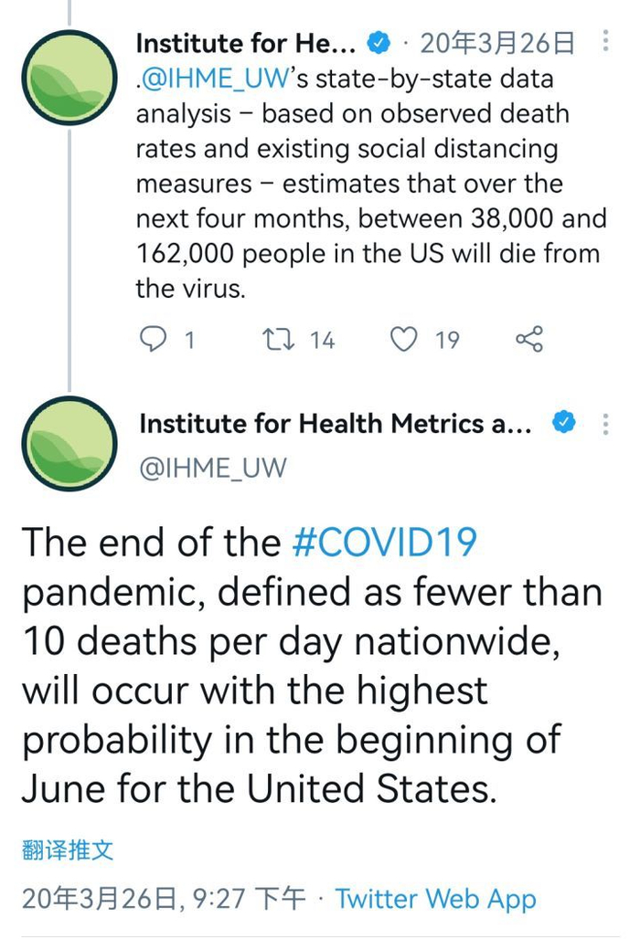 2020年3月26日,IHME在社交媒体宣布,“我们预测未来4个月,美国死于新冠的人数将在3.8万至16万人之间,然后疫情有最大概率会在6月份结束”。