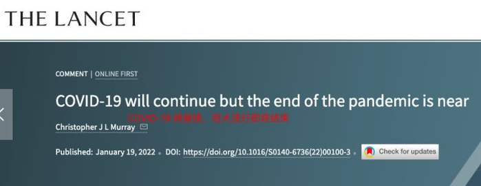 1月19日,《柳叶刀医学杂志》发表了一篇名为《COVID-19 将继续,但大流行即将结束》的文章,称新冠疫情即将结束。