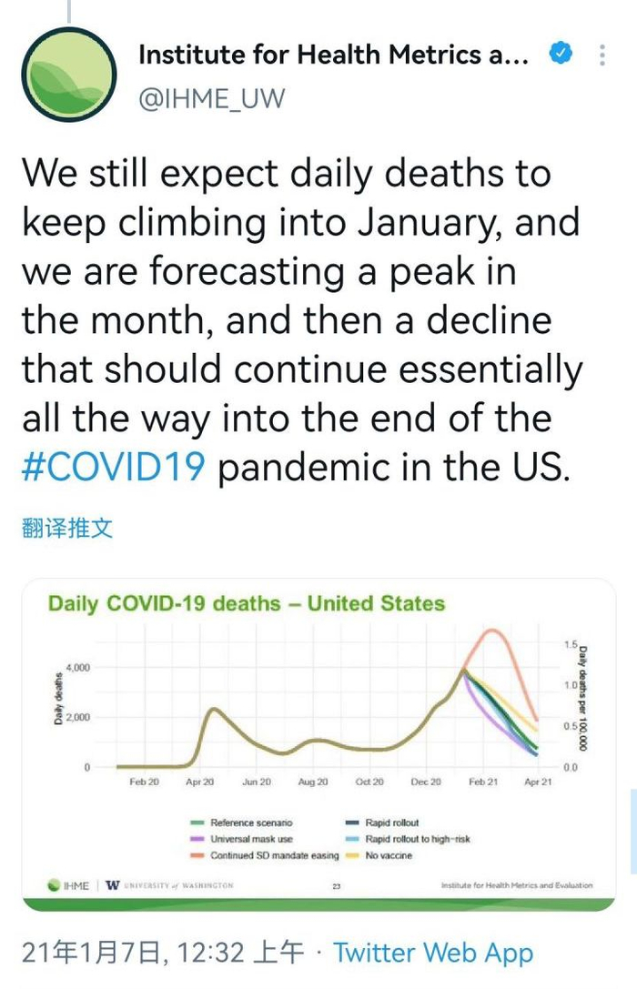 2021年1月7日,IHME再次预测,疫情会在未来一个月达到巅峰,然后持续下落,直到疫情结束。