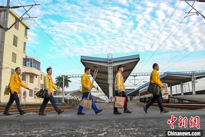 中新网南宁1月24日电(李钰丹)1月24日凌晨4时,湛江站四名身穿黄色线路服的作业人员正拿着扫把在线路上进行清扫。这群“清洁工”其实就是铁路信号工,他们定期为道岔“洗澡”,除的是设备污垢,保的是运输安全。