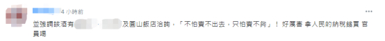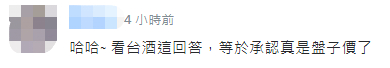 而针对台酒提到的,“总统府”、“外交部”及圆山饭店洽询,“不怕卖不出去,只怕卖不够”,有网友提出质疑,“那些机关的钱,是私人出的,还是纳税人的钱?请问一下?”“好厉害,拿人民的纳税钱买,官员喝。”