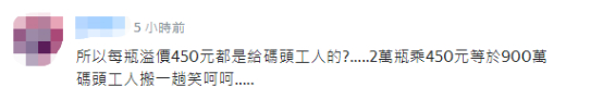 “看台酒这回答,等于承认真是盘子价了。”有人称,“所以每瓶溢价450元都是给码头工人的?。。。。。2万瓶乘450元等于900万,码头工人搬一趟笑呵呵。。。。。”