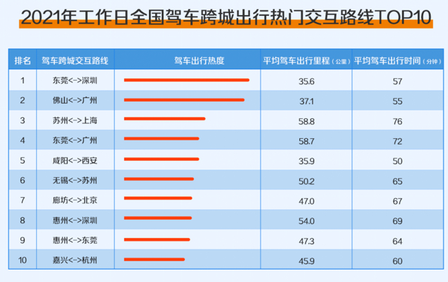 不久前高德地图发布的《2021年度中国主要城市交通分析报告》显示,在工作日期间,全国驾车跨城出行热门交互路线主要集中在珠三角、长三角、京津冀等城市圈,跨城出行十大“CP城市”分别是,东莞—深圳、佛山—广州、苏州—上海、东莞—广州、咸阳—西安、无锡—苏州、廊坊—北京、惠州—深圳、惠州—东莞、嘉兴—杭州。