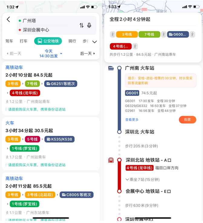 除了自驾,很多人跨城出行时愿意选择火车、城际高铁等公共交通方式,受高峰时期道路拥堵的影响相对较小。尤其对跨城通勤一族来说,路上的时间往往更要争分夺秒,高德地图同样可以为他们提供一站式、一体化的跨城公共出行服务。