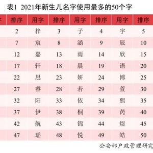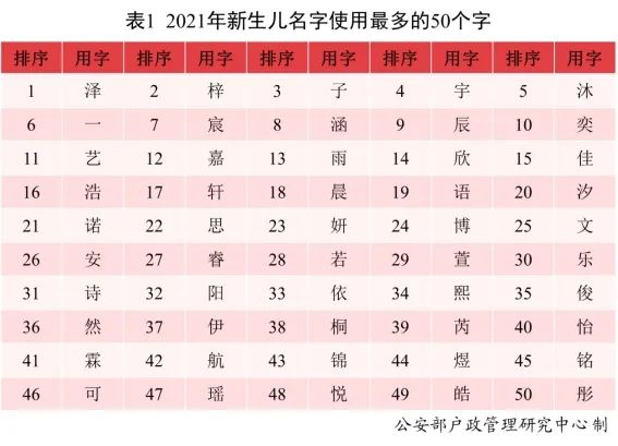 2021年出生并已经进行户籍登记的新生儿名字中,使用频率最高的50个字依次为泽、梓、子、宇、沐等。与2020年相比,汐、芮、霖、航等字受到青睐。