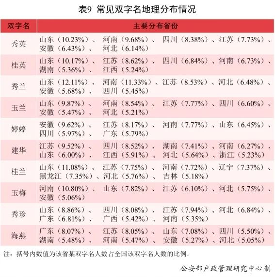 全国使用最多的10个双字名相对集中分布在山东、河南、四川、江苏、河北、湖南、安徽等省份。