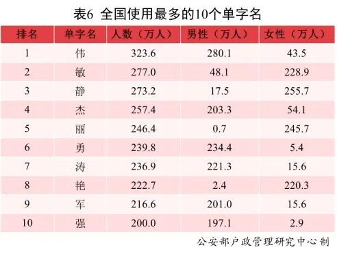 全国户籍人口中,使用频率最高的10个单字名依次为:伟、敏、静、杰、丽、勇、涛、艳、军、强。