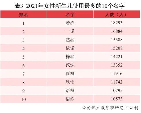 2021年出生并已经进行户籍登记的女性新生儿中,使用频率最高的10个名字依次为:若汐、一诺、艺涵、依诺、梓涵、苡沫、雨桐、欣怡、语桐、语汐。