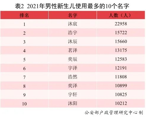 与2020年相比,除浩宇、奕辰、宇轩外,其余名字首次进入前十,其中“沐宸”使用人数达到2.3万,登顶榜首,成为男性新生儿名字首选。