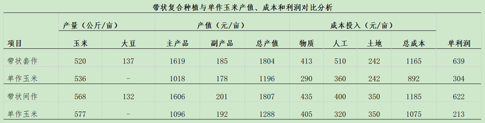 具体来说,该技术通过高秆作物与矮秆作物、碳三作物与碳四作物、养地作物与耗地作物搭配,带状间作和套作系统土地当量比分别达到1.42和2.36(分别相当于1亩地产出1.42和2.36亩地的粮食);同时,应用该技术后的玉米产量与原单作产量水平相当,新增带状套作大豆130~150公斤/亩,带状间作大豆100~130公斤/亩;亩增产值400~600元。