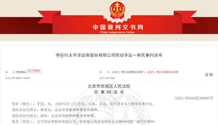 据该一审判决书显示,李某提出,自己于2019年3月5日经他人推荐通过面试,入职太平洋证券公司网络金融部,任运营兼综合岗位。