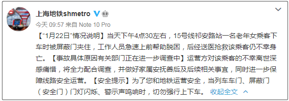1月22日下午4点30左右,上海地铁15号线祁安路站一名老年女乘客下车时被屏蔽门夹住,工作人员急速上前,试图帮助脱困,后经送医抢救该乘客仍不幸身亡。