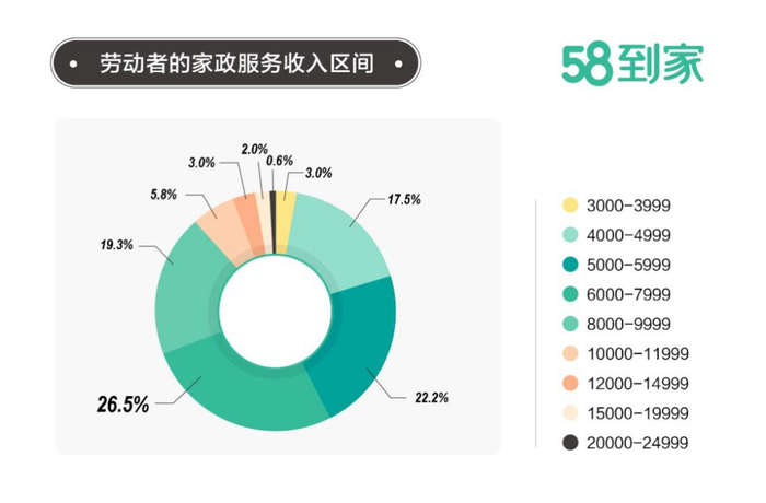 与此同时,家政市场近年持续火热,也让家政从业人员的薪酬水涨船高。58到家报告显示,57.2%的家政人员月收入在6000元以上,其中,月收入在6000-7999元的家政从业者占比最高,达26.5%。